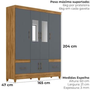 Projetado para atender às necessidades do dia a dia, o Guarda-Roupa Casal MS912 oferece espaço e modernidade. Estrutura em MDP (15/ 12 mm) e acabamento em pintura UV. Composto por portas com dobradiças metálicas (sendo 2 com espelho), cabideiro interno (alumínio), prateleiras e gavetas com corrediças metálicas. Produto com dupla opção de montagem: pés em PVC ou sapatas plásticas (2 mm) conforme preferência do cliente. Este produto será entregue em 03 volumes.