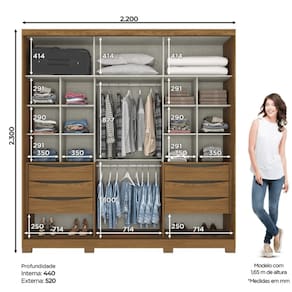 Cabideiros e calceiros em alumínio Gavetas com corrediças telescópicas Gavetas com usinagem para pega Prateleiras com divisórias em colmeia Puxadores em alumínio na cor bronze Portas divididas com acabamento soft Porta com espelhos