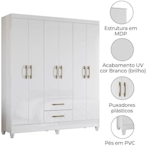 Guarda-roupa Casal Panamá, compacto, funcional e com design moderno. Estrutura em MDP (15/12 mm) e acabamento em pintura UV. Composto por portas com dobradiças metálicas, cabideiro interno (MDP revestido), prateleiras internas e gavetas com corrediças metálicas. Produto com dupla opção de montagem: pés em PVC ou sapatas plásticas (2mm), conforme preferência do cliente. Este produto será entregue em 02 volumes.