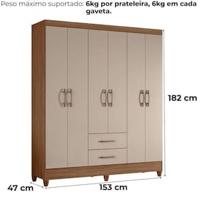 Guarda-roupa Casal Panamá, compacto, funcional e com design moderno. Estrutura em MDP (15/12 mm) e acabamento em pintura UV. Composto por portas com dobradiças metálicas, cabideiro interno (MDP revestido), prateleiras internas e gavetas com corrediças metálicas. Produto com dupla opção de montagem: pés em PVC ou sapatas plásticas (2mm), conforme preferência do cliente. Este produto será entregue em 02 volumes.
