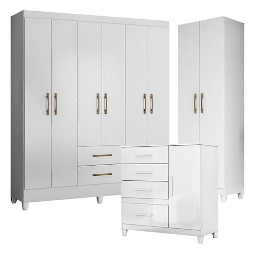 Guarda Roupa Casal Panamá com Cômoda Vênus com pés e Armário Multiuso New Íris Branco Brilho – Moval