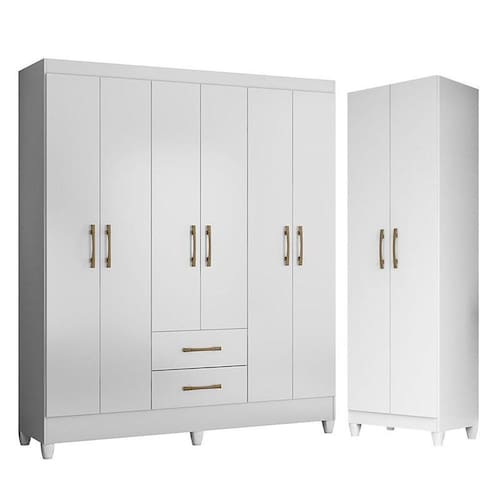 Organize seu quarto com elegância e o melhor custo beneficio do mercado. Apresentamos o Guarda Roupa Casal Panamá e Armário Multiuso New Iris fabricados pela Moval. Guarda Roupa com 06 portas e 02 gavetas com corrediças metálicas, espaço para roupas longas, puxadores na cor bronze, cabideiro em madeira para melhor organização interna e pés em PVC. O Armário Multiuso possui 02 portas, quatro prateleiras internas, cantoneira metálica para fixação na parede, puxadores na cor bronze, pés em PVC e um design moderno que combina com qualquer decoração. Fabricado com materiais de alta qualidade que garante resistência e durabilidade ao produto. Confira mais detalhes e aproveite!