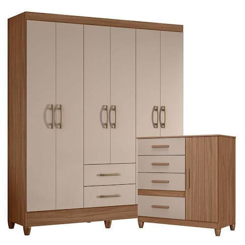 Organize seu quarto com elegância e o melhor custo beneficio do mercado. Apresentamos o Guarda Roupa Casal Panamá e Cômoda Venus fabricados pela Moval. Guarda Roupa com 06 portas e 02 gavetas com corrediças metálicas, espaço para roupas longas, puxadores na cor bronze, cabideiro para melhor organização interna e pés em PVC. A cômoda possui 04 gavetas com corrediças metálicas, 01 porta, 01 prateleira, detalhes frisados, puxadores em MDF e um design moderno que combina com qualquer decoração. Fabricado com materiais de alta qualidade que garante resistência e durabilidade ao produto. Confira mais detalhes e aproveite!