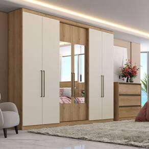 Transforme o quarto em um ambiente sofisticado e organizado com o Guarda Roupa Casal Passione Ultra Glass. Com design moderno e elegante, ele conta com 6 portas, sendo parte delas com detalhes em Ultra Glass, que proporcionam leveza visual e um toque contemporâneo ao ambiente. O acabamento em Capuccino Off White acetinado traz aconchego e requinte, enquanto o espaço interno foi planejado para atender todas as necessidades do casal. São amplas prateleiras, cabideiros resistentes e nichos bem distribuídos, que facilitam a organização de roupas, acessórios e calçados. Ideal para quem busca praticidade sem abrir mão do estilo, o Guarda Roupa Passione une funcionalidade, durabilidade e beleza, tornando-se a escolha perfeita para valorizar seu dormitório.