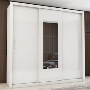 Com 2,08 metros de altura, 1,855 metros de largura e 0,47 metros de profundidade, ele oferece amplo espaco interno dividido de maneira funcional com 3 portas de correr, 4 prateleiras e 3 cabideiros. O design moderno, com espelho integrado, valoriza o ambiente e proporciona praticidade no dia a dia.