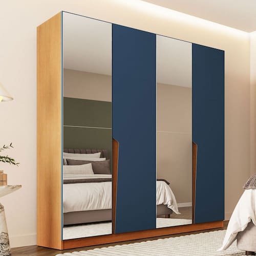 O(a) Guarda-Roupa Casal Porto 4 Portas 4 Gavetas com Espelho Freijó/Azul - Politorno é produzido em MDF e MDP na escala de brilho Semi-Fosco, e possui um grau de dificuldade de montagem: Médio.