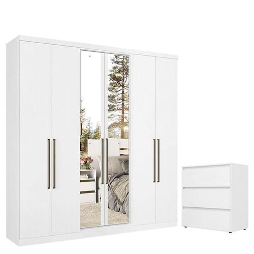 Guarda Roupa Casal Presence Full Glass 6 Portas e Cômoda Gaveteiro Condessa Branco Acetinado - THB