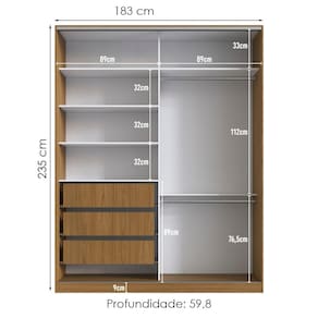 Guarda Roupa Casal RC2003 alia estilo e modernidade, trazendo mais sofisticação ao seu quarto. Com estrutura 100% em MDF 15 mm (fundo 3 mm) e acabamento BP fosco. Conta com portas de correr com abertura por trilho de alumínio, puxadores perfil em metal e gavetas com corrediças telescópicas (suportam até 5 kg cada). Interna com amplas prateleiras para armazenamento (suportam até 10kg cada) e cabideiros (superior e inferior) em aço. NÃO ACOMPANHA DECORAÇÕES. Este produto será entregue em 7 volumes.