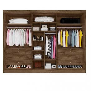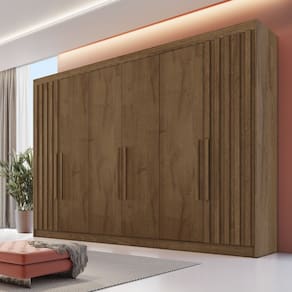 Características: Estrutura em MDF 6 Portas Dobradiças metálicas modelo caneco de 35 mm 6 Gavetas -duas com chave- 2 Sapateiras Gavetas e sapateiras com corrediças telescópicas Puxadores externos em madeira Cabideiros de alumínio Acabamento em verniz UV