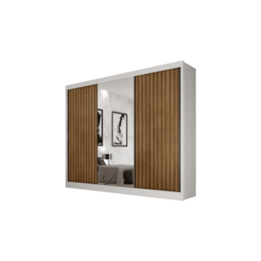 Particularidades do guarda-roupa: Características: - 100% MDF; - Colunado em 25mm; - Espelho com película de segurança;; - 4 Gavetas internas com puxadores; - Corrediças telescópicas; - Trilho inferior em alumínio e roldanas com amortecedores; - Roldana superior com guia zero e freio; - Fundo inteiriço; - Cabideiros em alumínio; - Duas opções de interno;