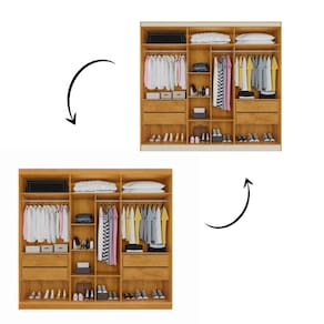 Caracteristicas: Material em MDF 6 Portas 4 Gavetas 4 Prateleiras Espelhos Corredicas telescopicas Detalhes ripados Puxadores em madeira Divisao ele e ela Gavetas suporta ate 4kg Prateleiras suporta ate 4kg Montagem flex escolher na hora da instalacao