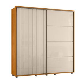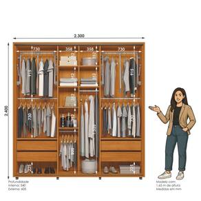 Características: 4 Gavetas com corrediças telescópicas 2 Portas de Correr sendo um ripada 8 Prateleiras Cabideiros retrateis com pistão a gás Estrutura em MDF 15mm e 25mm Fixação com minifix e parafusos Guia com amortecimento Moldura envoltória de 25mm Pés em poliestireno Perfil anti empenamento em aço Peso total suportado132Kg Puxadores e cabideiros em alumínio Trilhos em alumínio