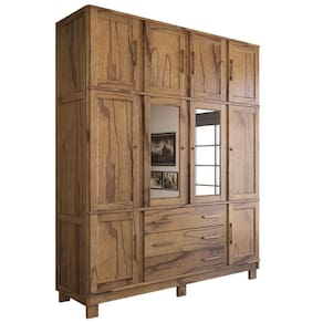 O(a) Guarda-Roupa Casal Rústico Madeira Maciça 10 Portas 3 Gavetas com Espelho e Pés Castanho - Loja é produzido em Madeira Maciça e Pinus na escala de brilho Alto Brilho, e possui um grau de dificuldade de montagem: Médio.
