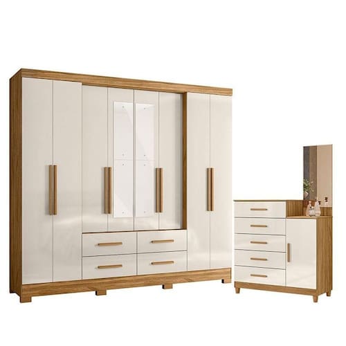 Organize seu quarto com elegância e o melhor custo benefício do mercado. Apresentamos o Guarda Roupa Casal San Lorenzo e Cômoda Lisboa fabricados pela Moval. Guarda Roupa com 08 portas, portas laterais avançadas, 04 gavetas com corrediças telescópicas, puxadores na cor bronze, cabideiro e calceiros em alumínio para melhor organização interna e pés em PVC. A cômoda possui 05 gavetas com corrediças metálicas, puxadores em MDF, 01 porta, painel com espelho, pés em PVC e um design moderno que combina com qualquer decoração. Fabricado com materiais de alta qualidade que garante resistência e durabilidade ao produto. Confira mais detalhes e aproveite!