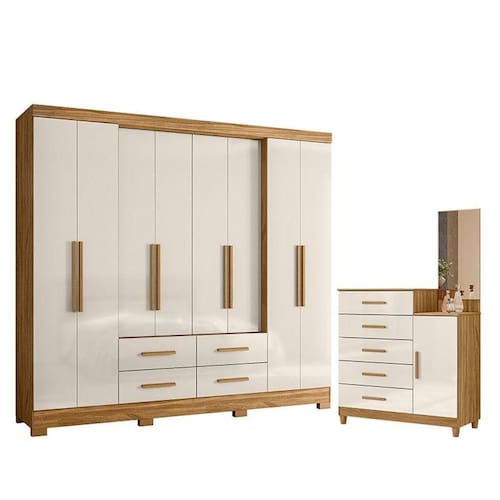 Organize seu quarto com elegância e o melhor custo benefício do mercado. Apresentamos o Guarda Roupa Casal San Lorenzo e Cômoda Lisboa fabricados pela Moval. Guarda Roupa com 08 portas, portas laterais avançadas, 04 gavetas com corrediças telescópicas, puxadores na cor bronze, cabideiro e calceiros em alumínio para melhor organização interna e pés em PVC. A cômoda possui 05 gavetas com corrediças metálicas, puxadores em MDF, 01 porta, painel com espelho, pés em PVC e um design moderno que combina com qualquer decoração. Fabricado com materiais de alta qualidade que garante resistência e durabilidade ao produto. Confira mais detalhes e aproveite!