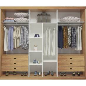 Possui 06 gavetas, com divisões ele/ela, espaço para vestido longo, colunas laterais em MDF 25mm, acabamento em Pintura UV semi brilho e 03 maleiros grandes com prateleiras fundas, para caber tudo que você precisa