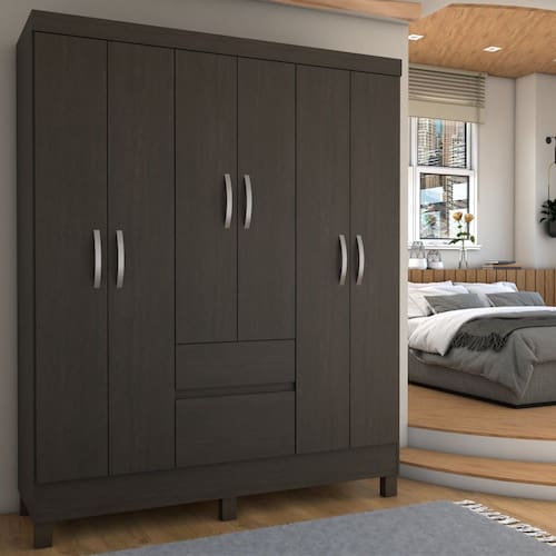 O(a) Guarda-Roupa Casal Senna 6 Portas 2 Gavetas ébano - Loja é produzido em MDP na escala de brilho Brilho e Fosca com Textura, e possui um grau de dificuldade de montagem: Difícil.