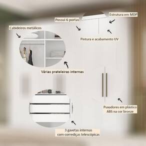 O Guarda Roupa Sumatra desenvolvido pela Demóbile irá te encantar! Sua estrutura em MDP super reforçado garante muito mais qualidade e durabilidade do móvel, conta com 6 portas, 3 gavetas, maleiro espaçoso e varias prateleiras internas com espaços bem distribuídos para uma boa acomodação de roupas e objetos. Seu design super moderno, valoriza e entrega muito charme e elegância ao ambiente, tornando perfeito para você. Confira e aproveite!