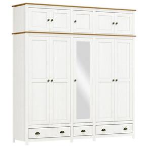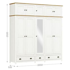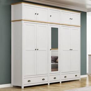 O Guarda-Roupa Casal Topázio 10 Portas e 3 Gavetas com Espelho da Finestra Móveis combina elegância, resistência e funcionalidade em um só móvel. Fabricado com estrutura em madeira maciça de pinus de reflorestamento, recebe acabamento refinado com pintura acetinada em verniz PU e UV, garantindo durabilidade e beleza por muito mais tempo. Com 10 portas, sendo a central com espelho, oferece amplo espaço para organização. As dobradiças com amortecimento proporcionam mais conforto e no uso diário. Conta ainda com prateleiras em madeira maciça que suportam até 10kg distribuídos, 3 gavetas com corrediças telescópicas para um deslizamento suave e cabideiros em alumínio com capacidade de até 8kg. Os puxadores metálicos em ouro envelhecido e os pés alongados em madeira maciça conferem um visual sofisticado e atemporal. Ideal para quem busca um guarda-roupa espaçoso, funcional e com design de alto padrão para o quarto do casal.