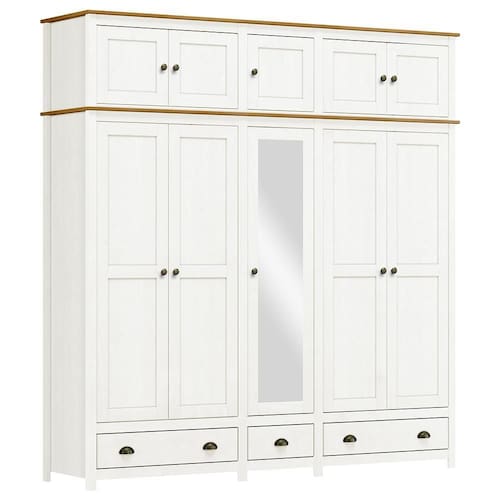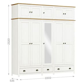 O Guarda-Roupa Casal Topázio 10 Portas e 3 Gavetas com Espelho da Finestra Móveis combina elegância, resistência e funcionalidade em um só móvel. Fabricado com estrutura em madeira maciça de pinus de reflorestamento, recebe acabamento refinado com pintura acetinada em verniz PU e UV, garantindo durabilidade e beleza por muito mais tempo. Com 10 portas, sendo a central com espelho, oferece amplo espaço para organização. As dobradiças com amortecimento proporcionam mais conforto e segurança no uso diário. Conta ainda com prateleiras em madeira maciça que suportam até 10kg distribuídos, 3 gavetas com corrediças telescópicas para um deslizamento suave e cabideiros em alumínio com capacidade de até 8kg. Os puxadores metálicos em ouro envelhecido e os pés alongados em madeira maciça conferem um visual sofisticado e atemporal. Ideal para quem busca um guarda-roupa espaçoso, funcional e com design de alto padrão para o quarto do casal.
