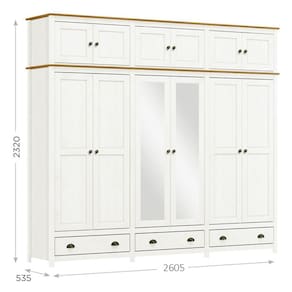 O Guarda-Roupa Casal Topázio 12 Portas e 3 Gavetas com Espelho da Finestra Móveis combina elegância, resistência e funcionalidade em um só móvel. Fabricado com estrutura em madeira maciça de pinus de reflorestamento, recebe acabamento refinado com pintura acetinada em verniz PU e UV, garantindo durabilidade e beleza por muito mais tempo. Com 12 portas, sendo as centrais com espelho, oferece amplo espaço para organização. As dobradiças com amortecimento proporcionam mais conforto e segurança no uso diário. Conta ainda com prateleiras em madeira maciça que suportam até 10kg distribuídos, 3 gavetas com corrediças telescópicas para um deslizamento suave e cabideiros em alumínio com capacidade de até 8kg. Os puxadores metálicos em ouro envelhecido e os pés alongados em madeira maciça conferem um visual sofisticado e atemporal. Ideal para quem busca um guarda-roupa espaçoso, funcional e com design de alto padrão para o quarto do casal.
