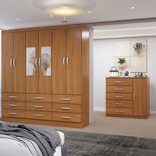 O(a) Guarda-Roupa Casal Tyler 6 Portas 9 Gavetas e Espelho com Cômoda 1 Porta 5 Gavetas Cinamomo - Loja é produzido em MDP na escala de brilho Fosco, e possui um grau de dificuldade de montagem: Médio.