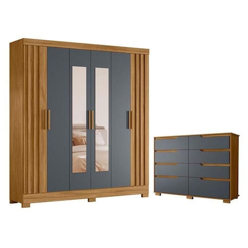 Organize seu quarto com elegância e o melhor custo benefício do mercado. Apresentamos o Guarda Roupa Casal Valença e Cômoda Georgia fabricados pela Moval. Guarda Roupa possui 06 portas, sendo duas com espelhos, além de outras duas com detalhes ripados em MDF, duas gavetas equipadas com corrediças telescópicas sendo as duas internas, puxadores em MDF, cabideiros em alumínio para melhor organização interna e pés em PVC. A cômoda possui 08 gavetas com corrediças telescópicas, puxadores usinados e pés em PVC. Fabricado com materiais de alta qualidade que garante resistência e durabilidade ao produto. Confira mais detalhes e aproveite!