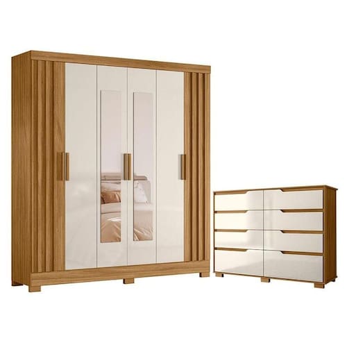 Organize seu quarto com elegância e o melhor custo benefício do mercado. Apresentamos o Guarda Roupa Casal Valença e Cômoda Georgia fabricados pela Moval. Guarda Roupa possui 06 portas, sendo duas com espelhos, além de outras duas com detalhes ripados em MDF, duas gavetas equipadas com corrediças telescópicas sendo as duas internas, puxadores em MDF, cabideiros em alumínio para melhor organização interna e pés em PVC. A cômoda possui 08 gavetas com corrediças telescópicas, puxadores usinados e pés em PVC. Fabricado com materiais de alta qualidade que garante resistência e durabilidade ao produto. Confira mais detalhes e aproveite!