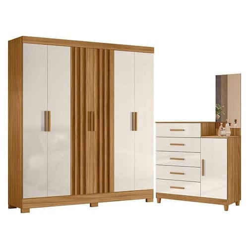 Organize seu quarto com elegância e o melhor custo benefício do mercado. Apresentamos o Guarda Roupa Casal Valença e Cômoda Lisboa fabricados pela Moval. Guarda Roupa possui 06 portas, sendo duas com detalhes ripados em MDF, sua porta conta com duas opções na hora de montar, duas gavetas equipadas com corrediças telescópicas sendo as duas internas, puxadores em MDF, cabideiros em alumínio para melhor organização interna e pés em PVC. . A cômoda possui 05 gavetas com corrediças metálicas, painel com espelho, puxadores em MDF e pés em PVC. Fabricado com materiais de alta qualidade que garante resistência e durabilidade ao produto. Confira mais detalhes e aproveite!