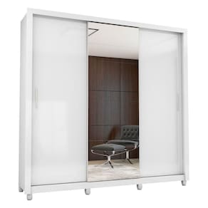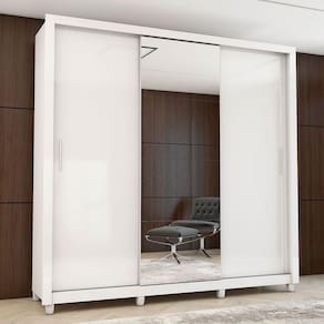 O Guarda Roupa Clara Plus 3 Portas de Correr 4 Gavetas com Espelho e Pes da Carioca Moveis traz conforto, sofisticacao e praticidade. Combinado com 4 gavetas, 4 prateleiras e 3 cabideiros, deixa o produto com uma divisao funcional capaz de proporcionar ao cliente acomodar todas as suas roupas de maneira mais organizada e com maior visibilidade. Com maleiro para organizar as pecas maiores, e ideal para guardar malas, cobertores e edredons. Os tres cabideiros, alem de resistentes, sao ideais para pendurar camisas, calcas, vestidos, sobretudos, entre outros. Conta com prateleiras para colocar roupas de cama e de banho, perfumes, kits de maquiagem, caixinhas com acessorios e bolsas menores e com quatro gavetas fixadas sobre corredicas metalicas.