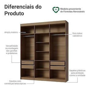 O closet conta com dois cabideiros, várias prateleiras amplas e quatro gavetas espaçosas, garantindo flexibilidade e espaço suficiente para acomodar roupas, calçados e acessórios com facilidade. As gavetas com corrediças telescópicas permitem abertura total, enquanto o amplo maleiro é perfeito para itens maiores. Além disso, você pode ajustar as gavetas e prateleiras para personalizar o interior conforme suas necessidades.