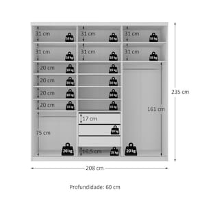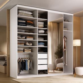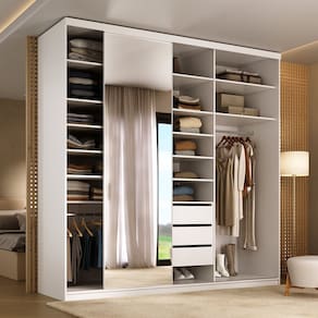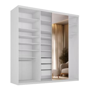 Conta com gavetas com corrediças telescópicas para deslizamento suave, além de espelho inteiriço na porta de correr, que traz elegância e amplitude ao quarto. Sua distribuição interna inteligente facilita a organização do dia a dia, oferecendo qualidade de móveis planejados em um produto pronto para transformar seu espaço. Acabamento da Prateleira: BP Melamínico Escala de Brilho da Prateleira: Fosco Possui Cabideiros: Sim Acabamento da Gaveta: BP Melamínico Escala de Brilho da Gaveta: Fosco Possui Organizador de Gaveta: Não Acabamento da Porta: BP Melamínico Escala de Brilho da Porta: Fosco Material do Puxador da Porta: Alumínio Acabamento dos Pés: BP Melamínico Altura do Espelho: 223 cm Altura dos Pés: 6 cm Altura Máxima dos Pés: 6.0000 Ambiente Principal: Quarto codigo_ean: 7900288256935 Complexidade da Montagem: Alta: deve ser montado por um montador especializado Cor: Branco Cor da Porta: Espelhado Cor do Produto: Branco Escala de Brilho: Fosco Espessura da Estrutura (mm): 15 mm Espessura das Portas (mm): 18 mm Espessura das Prateleiras (mm): 15 mm Espessura do Espelho: 3 mm Espessura do Fundo (mm): 3 mm Espessura do Fundo das Gavetas (mm): 3 mm Formato do Espelho: Retangular Gaveta com Chave: Não Itens Inclusos: 1 Guarda-Roupa, Kit Ferragens e Manual de Montagem Largura do Espelho: 66 cm Linha ou Coleção: Sion Manual de Montagem e Instalação: https://product-hub-prd.madeiramadeira.com.br/586686358/documents/3a3e3c56-f7e6-4bcc-8ca1-1e116d3faf44326508094517598614830982.pdf Marca: RR Móveis Material da Gaveta: MDF Material da Porta: MDF Material da Prateleira: MDF Material dos Pés: MDF Material Principal: MDF modular: Não Necessita Montagem: Sim Origem do Produto: Nacional Peso: 180 kg Peso Máximo por Gaveta: 10 kg Peso Máximo por Prateleira: 10 kg Porta Janelada: Não Possui Calceiros: 01 Possui Espelho: Sim Possui Pés: Rodapé Possui Portas: Sim Possui Prateleiras: Sim Produto Montado: Sim Quantidade de Cabideiros: 01 Cabideiro Quantidade de Espelho: 01 Quantidade de Gavetas: 03 Gavetas Quantidade de Portas com Espelhos: 1 Porta com Espelho Quantidade de Prateleiras: 13 Prateleiras Recomendações de Uso, Manutenção e Limpeza: Pano Umido Sapatas Niveladoras: Sim Sistema de Montagem: Parafusos e Cavilhas Tipo de Corrediça da Gaveta: Metálica Telescópica Tipo de Dobradiça/Corrediça da Porta: Metálica Tipo de Fixação do Espelho: Silicone Tipo de Gaveta: Interna Tipo de Guarda-Roupa: Casal Tipo de Puxador da Gaveta: Não Possui Tipo de Puxador da Porta: Externo Marca: Não Informado