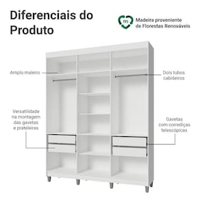 Cor: Branco | Garantia: 12 meses | Marca: Madesa | Material: MDP | Estado de Origem: RS | Conteúdo da embalagem: Um Closet | Material para Filtro: MDP | Instruções/Cuidados: Utilize um pano limpo, levemente umedecido e seque em seguida a superfície. Não usar produtos químicos ou abrasivos para a limpeza. Recomendamos polir seu móvel com lustra-móveis duas a três vezes por ano. | Produto precisa de Montagem?: Sim | Peso Produto Com Embalagem (Kg): 82,15 | Altura do Produto com Embalagem (cm): 28,80 | Largura Produto Com Embalagem (cm): 46,30 | Comprimento Produto Com Embalagem (cm): 223,3,00 | Descrição do Tamanho: 227 cm x 180 cm x 45 cm | Nome do Simples no Fornecedor: Guarda-Roupa Closet com Pés 4 Gavetas 180cm Branco Venus Madesa | Fabricante: Madesa | RBN: Casa/Móveis/Móveis para Escritório em Casa | Quantidade de Gavetas: 4 | Materiais do corpo: MDP | Quantidade de caixas de embalagem: 3 | Bullet Point 0: Dimensões: 227 cm altura x 180 cm largura x 45 cm profundidade | Bullet Point 1: O grande diferencial desta versão está nos pés, que elevam o móvel e facilitam a limpeza do quarto. | Bullet Point 2: Gavetas com corrediças telescópicas para deslize suave e dobradiças com amortecimento para fechamento silencioso | Bullet Point 3: O Closet Venus da Madesa é a escolha ideal para quem busca organização e praticidade com um design moderno. | É Frágil: Não | Quantidade de Itens: 1 | Certificação de teste externa: Sim | model_number: 110609CL4GL1CP | Componentes incluídos: Portas | Precisa de baterias ou pilhas: Não | Número da peça: 110609CL4GL1CP | Peso do item (item_weight): value=82.15;unit=kilograms | Dimensões do artigo (item_dimensions): depth#value=45;depth#unit=centimeters;height#value=227;height#unit=centimeters;width#value=180;width#unit=centimeters | Linha: | Requer montagem (REQUIRES_ASSEMBLY): Sim | Inclui manual de montagem (INCLUDES_ASSEMBLY_MANUAL): Sim | number_of_boxes: 3 | is_assembly_required: Sim | Com corrediças telescópicas: Sim | Com espelho: Não | Estilo: Moderno | Inclui manual de montagem: Sim | item_depth_width_height: depth#value=45;depth#unit=centimeters;height#value=227;height#unit=centimeters;width#value=180;width#unit=centimeters | Tipo de Guarda Roupa: Modulado | Tonalidade: Branco | Quantidade de Portas: 0 | Dimensões - Altura: 227 | Produto: Guarda-roupa Modulado | Dimensões - Largura: 180 | Dimensões - Profundidade: 45 | Peso aproximado: 82 | Cor: Branco