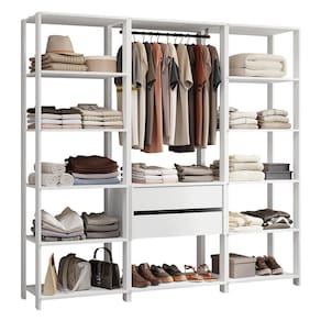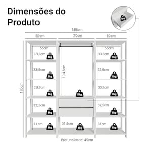 Um dos módulos conta com duas gavetas espaçosas, um cabideiro e uma prateleira, enquanto os outros dois módulos de 59 cm de largura oferecem cinco prateleiras amplas cada, garantindo um espaço de armazenamento eficiente e organizado.