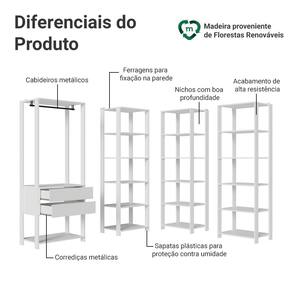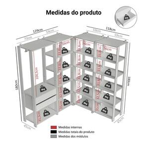 Cada módulo foi projetado para proporcionar um espaço de armazenamento organizado, unindo praticidade e estilo para seu ambiente. Você vai receber três closets abertos de 59 cm de largura, cada um com cinco prateleiras amplas, perfeitos para roupas dobradas e calçados. E um closet aberto de 70 cm de largura, com duas gavetas espaçosas, ideais para itens menores e acessórios, além dos cabideiros.