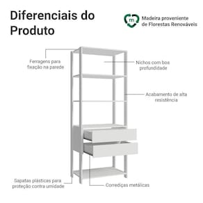 O Closet conta com duas gavetas e quatro prateleiras amplas, ideais para roupas dobradas, cais organizadoras, sapatos e itens pessoais Além disso, o móvel conta com acabamento branco de alta resistência, pés com sapatas plásticas que protegem contra a umidade e ferragens incluídas para a fição na parede, garantindo mais estabilidade e .