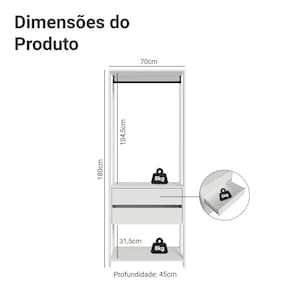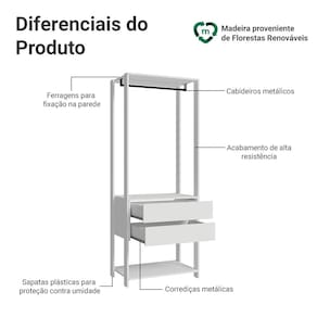 O Closet conta duas gavetas com corrediças que permitem abertura total e um cabideiro metálico para manter tudo no lugar, com visibilidade e funcionalidade. Além disso, o móvel conta com acabamento branco de alta resistência, pés com sapatas plásticas que protegem contra a umidade e ferragens incluídas para a fição na parede, garantindo mais estabilidade e segurança.
