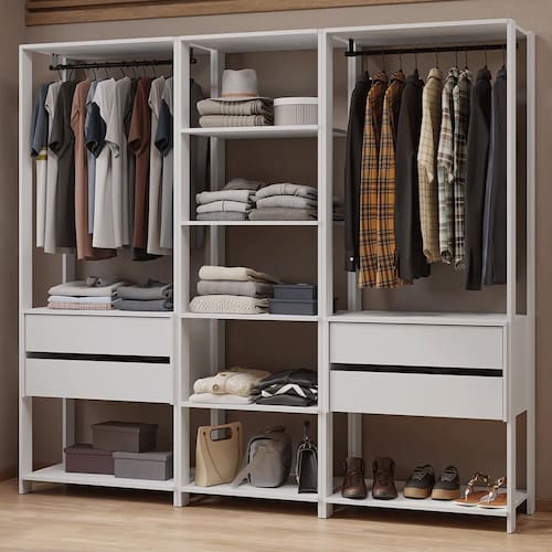 - Um Closet aberto de 59 cm de largura com cinco prateleiras