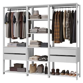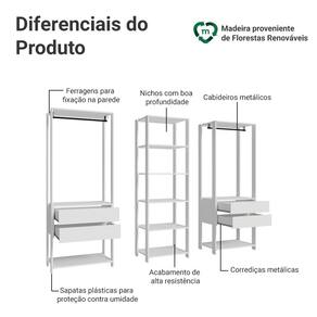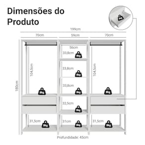 Um dos módulos conta com cinco prateleiras amplas, enquanto os outros dois módulos de 70 cm de largura oferecem duas gavetas espaçosas, um cabideiro e uma prateira em cada, garantindo um espaço de armazenamento eficiente e organizado.