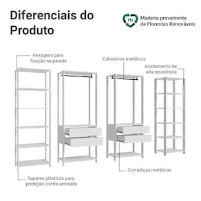 Cada módulo foi projetado para proporcionar um espaço de armazenamento eficiente e organizado, unindo praticidade e estilo para seu ambiente. Você vai receber dois closets abertos de 59 cm de largura, cada um com cinco prateleiras amplas, perfeitos para roupas dobradas, calçados e acessórios. E mais dois closets abertos de 70 cm de largura, cada um com duas gavetas espaçosas, ideais para itens menores e acessórios, além de prateleiras amplas para roupas e objetos pessoais.