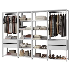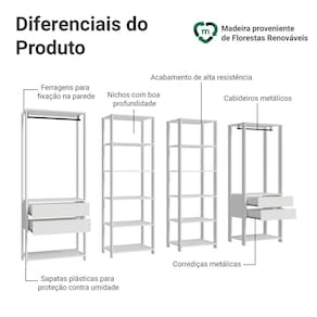 Cada módulo foi projetado para proporcionar um espaço de armazenamento eficiente e organizado, unindo praticidade e estilo para seu ambiente. Você vai receber dois closets abertos de 59 cm de largura, cada um com cinco prateleiras amplas, perfeitos para roupas dobradas, calçados e acessórios. E mais dois closets abertos de 70 cm de largura, cada um com duas gavetas espaçosas, ideais para itens menores e acessórios, além dos cabideiros.