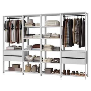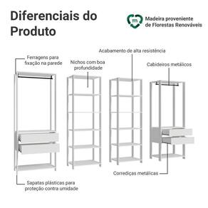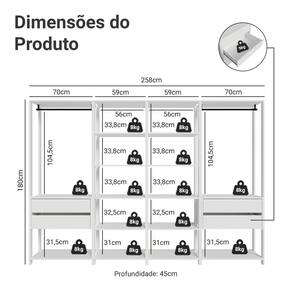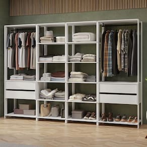 Cada módulo foi projetado para proporcionar um espaço de armazenamento eficiente e organizado, unindo praticidade e estilo para seu ambiente. Você vai receber dois closets abertos de 59 cm de largura, cada um com cinco prateleiras amplas, perfeitos para roupas dobradas, calçados e acessórios. E mais dois closets abertos de 70 cm de largura, cada um com duas gavetas espaçosas, ideais para itens menores e acessórios, além dos cabideiros.