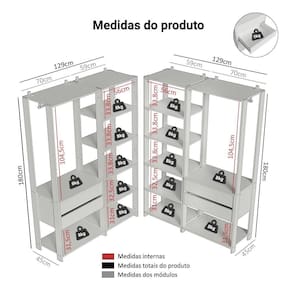 Cada módulo foi projetado para proporcionar um espaço de armazenamento organizado, unindo praticidade e estilo para seu ambiente. Você vai receber dois closets abertos de 59 cm de largura, cada um com cinco prateleiras amplas, perfeitos para roupas dobradas, calçados e acessórios. E mais dois closets abertos de 70 cm de largura, cada um com duas gavetas espaçosas, ideais para itens menores e acessórios, além dos cabideiros.