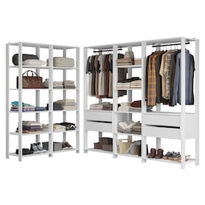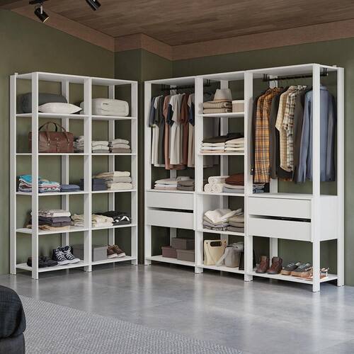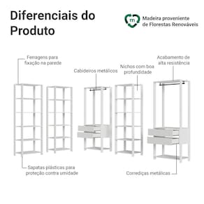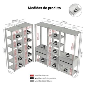Cada módulo foi projetado para proporcionar um espaço de armazenamento organizado, unindo praticidade e estilo para seu ambiente. Você vai receber três closets abertos de 59 cm de largura, cada um com cinco prateleiras amplas, perfeitos para roupas dobradas e calçados. E dois closets abertos de 70 cm de largura, cada um com duas gavetas espaçosas, ideais para itens menores e acessórios, além dos cabideiros.