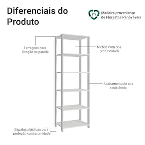 O Closet possui cinco prateleiras amplas, ideais para roupas dobradas, cais organizadoras, sapatos e itens pessoais Além disso, o móvel conta com acabamento branco de alta resistência, pés com sapatas plásticas que protegem contra a umidade e ferragens incluídas para a fição na parede, garantindo mais estabilidade e segurança.