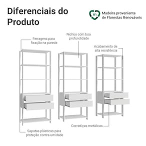 Além disso, o móvel conta com acabamento branco de alta resistência, pés com sapatas plásticas que protegem contra a umidade e ferragens incluídas para a fição na parede, garantindo mais estabilidade e segurança.