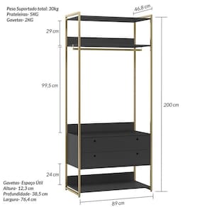 1x Guarda Roupa Modulado Closet Industrial 89cm 2 Portas 2 Gavetas Preto Ac Largura: 89 cm Altura: 200 cm Peso: 60,4 kg Profundidade: 46,8 cm Necessita Montagem: Sim