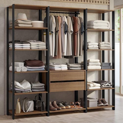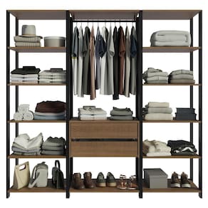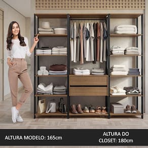 Sua estrutura aberta foi projetada para oferecer fácil acesso aos seus objetos no dia a dia. Nesta versão, possui três peças independentes com dois cabideiros metálicos, várias prateleiras amplas e duas gavetas espaçosas.