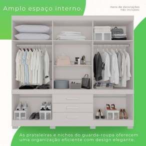 Organize e encontre com mais facilidade suas roupas preferidas com o auxílio deste atraente Guarda-Roupa com Espelho Parma Premium. Confeccionado com materiais de qualidade e resistência, ele é a opção mais acertada para deixar seu dormitório muito mais arrumado e convidativo com um design elegante e moderno. Com interior espaçoso, este roupeiro conta com três gavetas de corrediças telescópicas, nove prateleiras e dois cabideiros para uma boa organização. Produzido com materiais de ótima qualidade unindo funcionalidade e beleza, ele conta com divisão ele e ela e sapateira embutida. Para garantir uma maior sustentação temos um suporte embutido reforçando a gaveta. Um excelente móvel para completar o seu quarto.