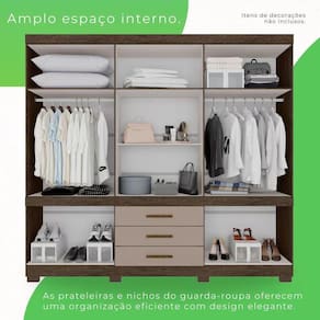 Organize e encontre com mais facilidade suas roupas preferidas com o auxílio deste atraente Guarda-Roupa com Espelho Parma Premium. Confeccionado com materiais de qualidade e resistência, ele é a opção mais acertada para deixar seu dormitório muito mais arrumado e convidativo com um design elegante e moderno. Com interior espaçoso, este roupeiro conta com três gavetas de corrediças telescópicas, nove prateleiras e dois cabideiros para uma boa organização. Produzido com materiais de ótima qualidade unindo funcionalidade e beleza, ele conta com divisão ele e ela e sapateira embutida. Para garantir uma maior sustentação temos um suporte embutido reforçando a gaveta. Um excelente móvel para completar o seu quarto.